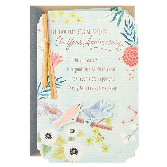 Send warm wishes to your parents on their wedding anniversary with this sweet card. Featuring a pair of pretty birds sitting on a flowering tree branch, knotted satin ribbons and glitter accents, this greeting shares a celebratory message for loving parents.- Anniversary greeting card for your parents features glitter accents, dimensional die-cut bird attachments, layered satin ribbons and beveled corners.