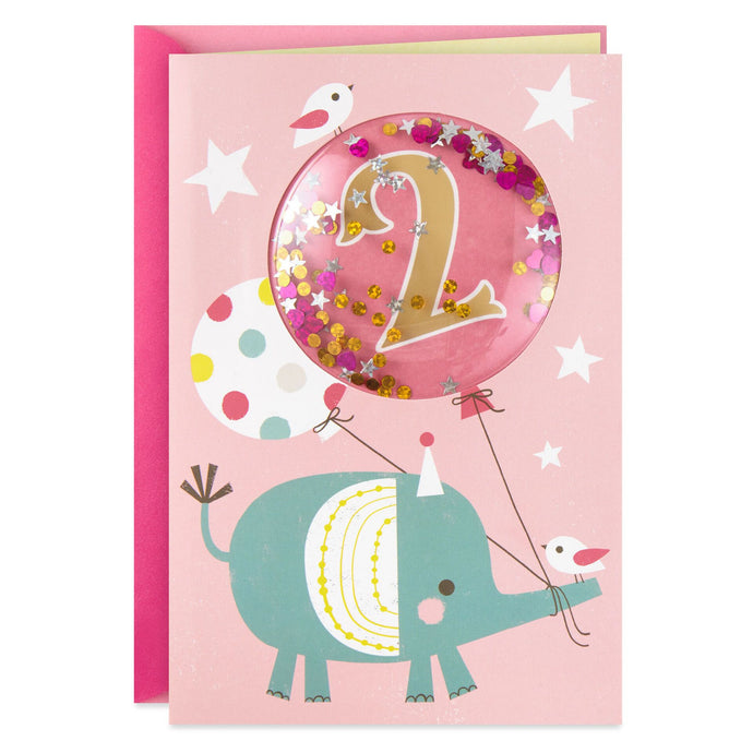 Elephants and balloons pair up to create a sweet scene for a milestone second birthday on the cover of this card. Shiny foil and confetti pieces under a clear plastic overlay dress up the raised design for a fun finish.- Birthday greeting card features foil and confetti under clear round overlay.