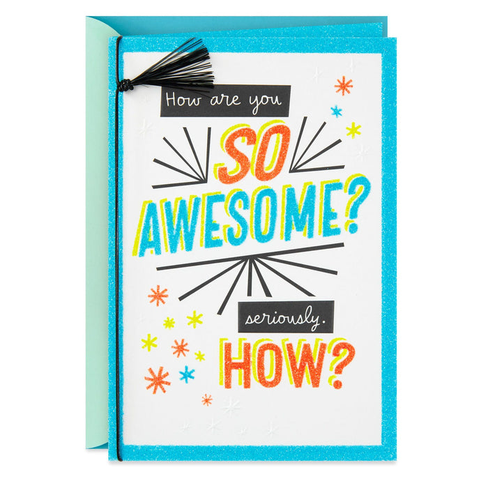 Do you know someone who qualifies for the all-time awesome list? Deliver this glittery masterpiece of a thank-you card to the deserving guy or gal with a thank you, a smile and a few words of praise.- Thank-you card features raised design, elastic cord with tassel and glitter.