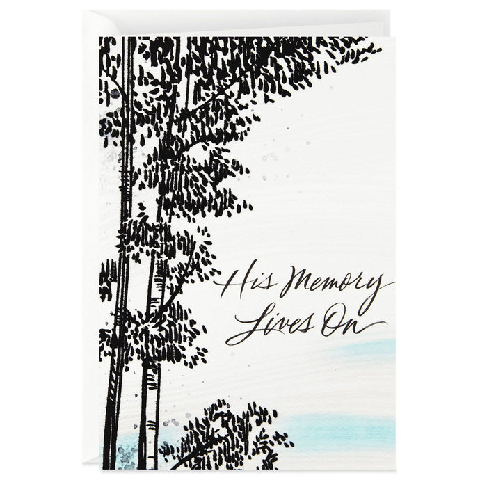 Ease the burden of a friend whose husband, brother, son or father has died with this gentle message of love and comfort. Card features an appealing black and white sketch design of a textured tree in winter with a splash of light blue and shiny silver accents.- Sympathy card features embossed design.
