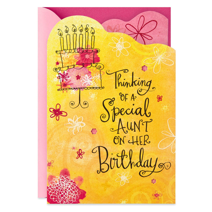 - Birthday greeting card for your aunt features a multi-panel design with a floral birthday cake, glitter accents and die-cut flower details.