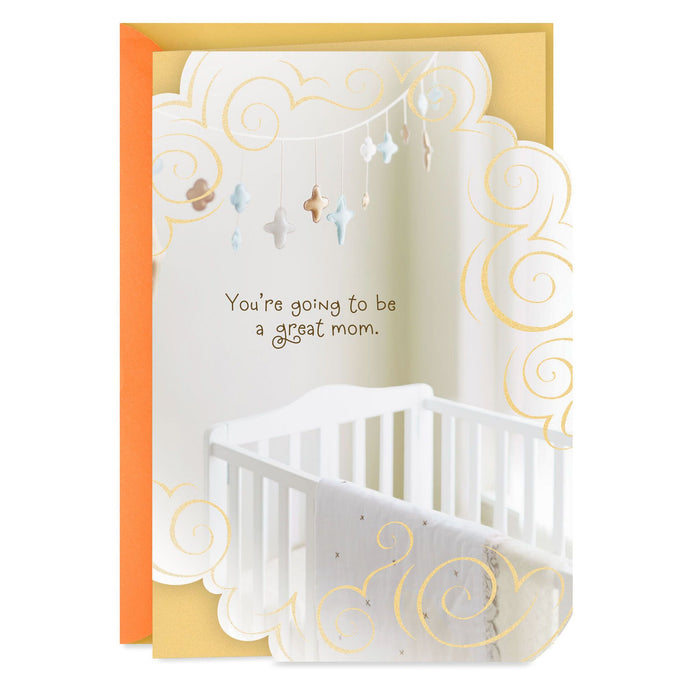How do you know she's going to be a great mom? Because you already know what an amazing person she is! Congratulate her on a brand-new baby with this heartfelt card featuring a mobile hanging over a baby crib. Shiny accents add sweet finishing touches.- New baby greeting card features die-cut edges and metallic ink.