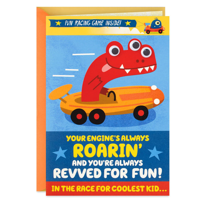 Rev up the fun for one cool kid with this birthday card filled with adventure. Multi-panel greeting features a red monster with googly eyes in a racecar on the cover and a fun game to play inside.- Birthday greeting card features googly eye attachments, die-cut and glossy accents, and a multi-panel design that unfolds to reveal a fun activity game.