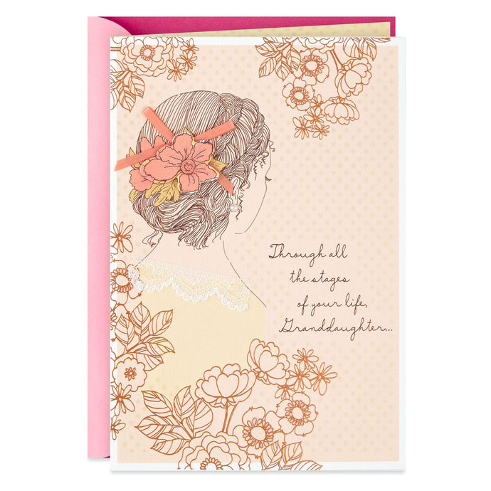 - Birthday greeting card for your granddaughter features an illustrated silhouette of a young woman with a die-cut flower and satin ribbon in her hair. Faux pearl accents and metallic ink polka dots add sweet finishing touches.
