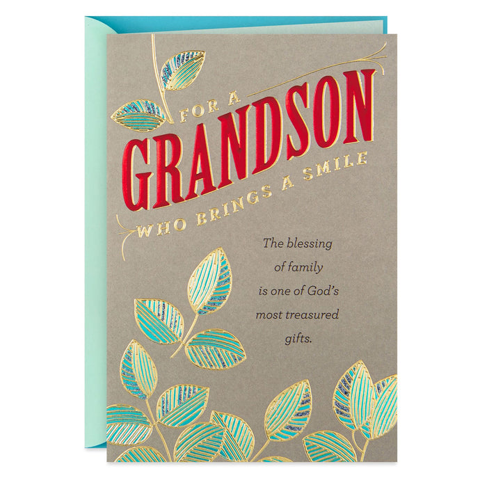 Bright red foil and gold accents against a gray background offer a cheerful happy birthday greeting for your grandson who makes your heart smile. Share all the pride you feel in him when you give this love-filled card that's finished with embossed leaf accents.- Birthday greeting card features glitter, embossing and foil.