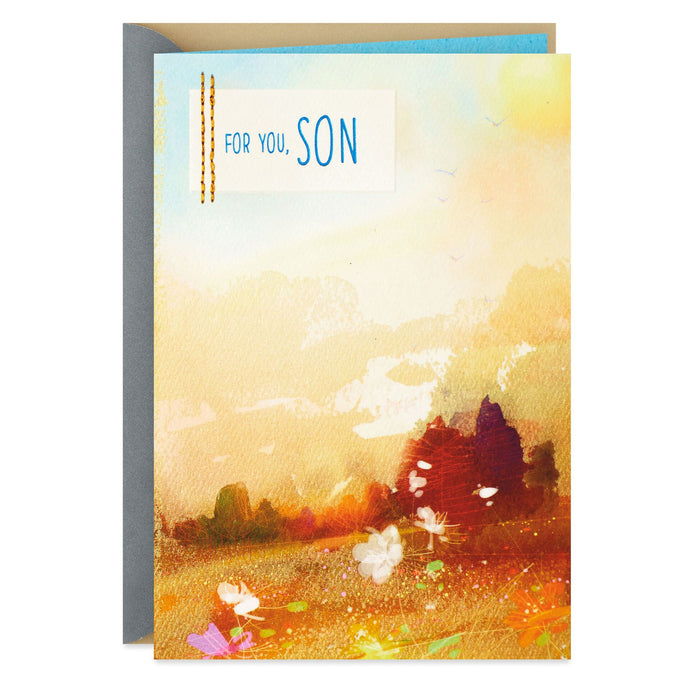 Celebrate an adult son's birthday with this charming nature watercolor birthday greeting. Card features words from the heart, an embossed "For You, Son" tag and two rows of machine-stitched accents.- Birthday greeting card features embossing, foil, metallic ink and stitched details.