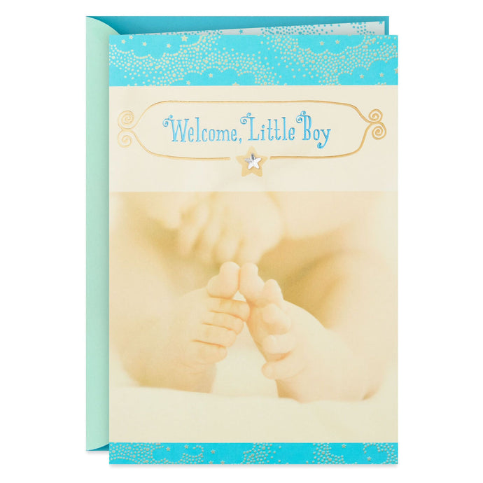 Send warm, welcoming wishes to the parents of a new little baby boy with this sweet congratulations card. Its design features a close-up photo of baby toes along with sweet accents of gold and blue foil, metallic ink and a tiny silver star.- New baby boy greeting card features foil accents, metallic ink and star-shaped gem attachment.