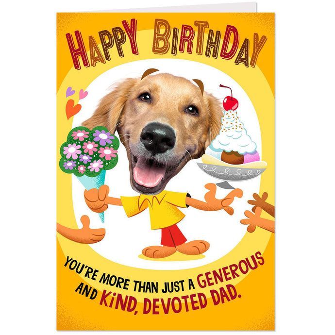 - Birthday greeting card for a generous, kind and devoted dad features fun dog photo illustrations, a multi-panel design and a pop-up effect on the inside.