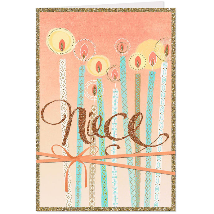 - Birthday greeting card for your niece features a birthday candle illustration with sparkly glitter accents, a satin ribbon attachment and warm message.