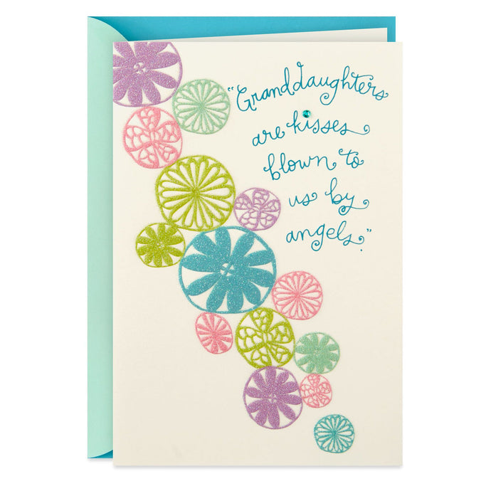 - Birthday greeting card for your granddaughter features glittery flowers in purple, blue, pink and green hues and a gemstone accent.