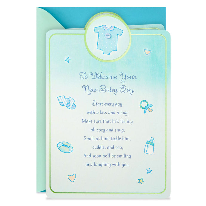 From the so-cute onesie image adorned with a button to the other sweet baby icons decorating this card, it's all cuddles and coos as you welcome a new baby boy. The die-cut design of a teddy bear and rattle and shiny foil accents add enchantment to the message about the many lovely things new parents have to look forward to.- New Baby greeting card features die-cut design, foil and button.