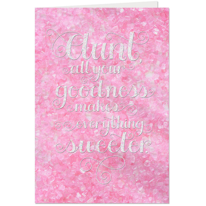 - Birthday greeting card for your aunt features a close-up photograph of pink sugar crystals with glitter accents and sweet birthday wishes.