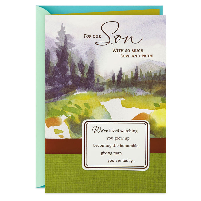 Celebrate your son's birthday with pride in this encouraging birthday greeting. Its heart-to-heart message spells out his list of incredible qualities, set in a serene watercolor landscape design, sharing your admiration for him and the wonderful example he sets for his own children.- Birthday greeting card features die-cut design, foil and satin ribbon.