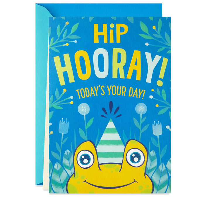 A friendly frog and bold, block lettering create a festive scene on the cover of this birthday card, which opens to reveal a pop-up feature inside. Shiny foil accents dress up the design for a fun finish.- Birthday greeting card features pop-up design with foil and raised accents.
