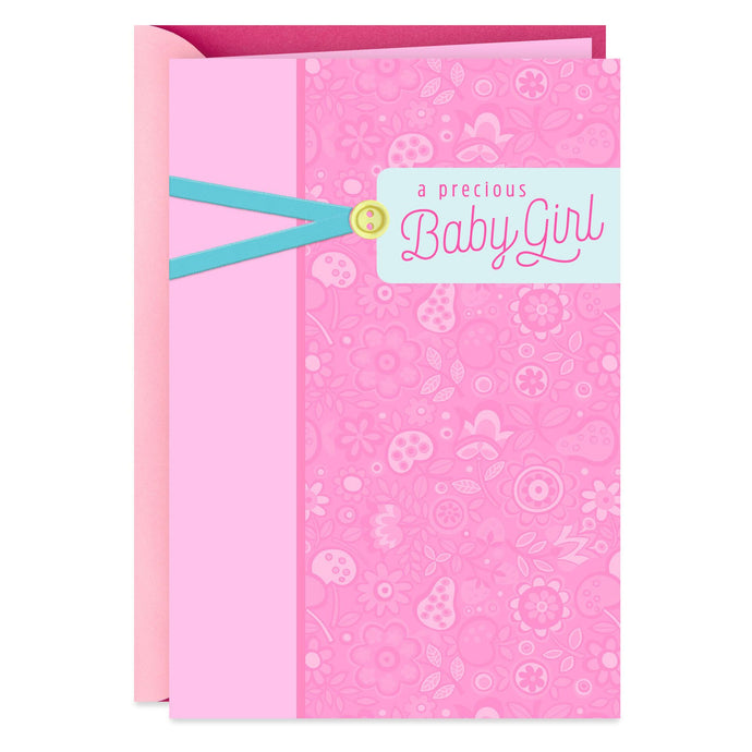Share this charming card with the family whose home has been graced with a daughter. This new baby greeting features darling accents like swirling glitter, sequins and foil lettering, along with a sweet message about this tiny yet fierce little girl.- New baby girl greeting card features glitter, flocking, foil, sequins and die-cut accents.