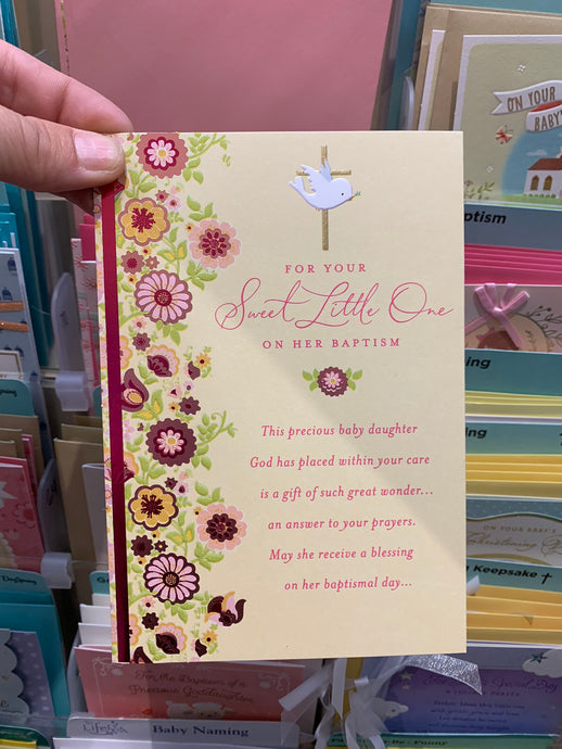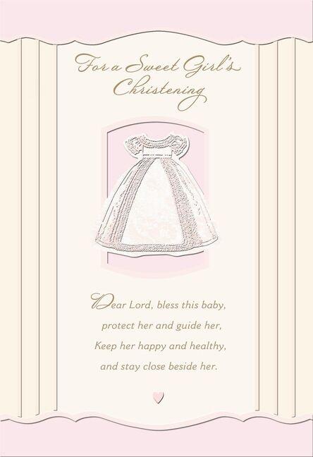 Share your joy about a new baby girl's christening with this fanciful greeting card with a prayer for baby and a sweet wish for a lifetime of happiness for the new family. Greeting features die-cut baptismal gown and bow with glitter accents.- Christening greeting card features glitter, embossing, die-cut design and a satin ribbon bow.