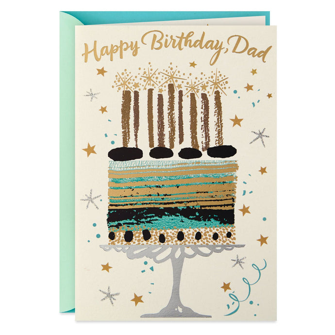 Make a wonderful dad's day happy with this heartfelt birthday greeting that lets him know you're not just counting the years, but also the many ways that he makes such a positive difference in your life. B-day card features a birthday cake and candle design with sparkling silver glitter starbursts and shiny silver and gold foil design embellishments.- Birthday greeting card features glitter, foil, metallic ink and glossy accents.