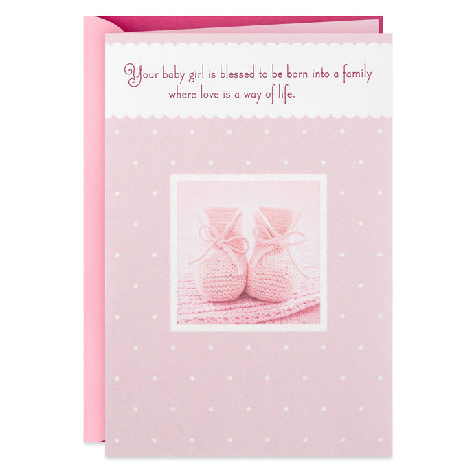 An "aww"-inspiring card is sweeter than sweet. The cover features a photo of two adorable crocheted baby booties resting on a crocheted baby blanket, surrounded by pink with white dots and dressed up with glitter, embossing, foil and metallic ink. A heartfelt message celebrates the fact that this new baby girl is being born into a family where love is a way of life.- New Baby greeting card features glitter, embossing, foil and metallic ink.