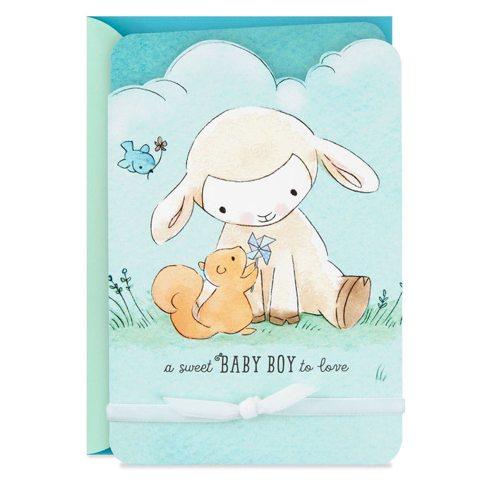 It's amazing how tiny things can add up to great big love. Help the new parents welcome their baby boy and celebrate all the joy he's sure to bring with this illustrated card featuring a lamb and squirrel against a teal blue sky. Greeting features embossing, fuzzy accents and velvety ribbon trim.- New baby greeting card for baby boy features a die-cut edge, embossing, flocking and a velvet ribbon.
