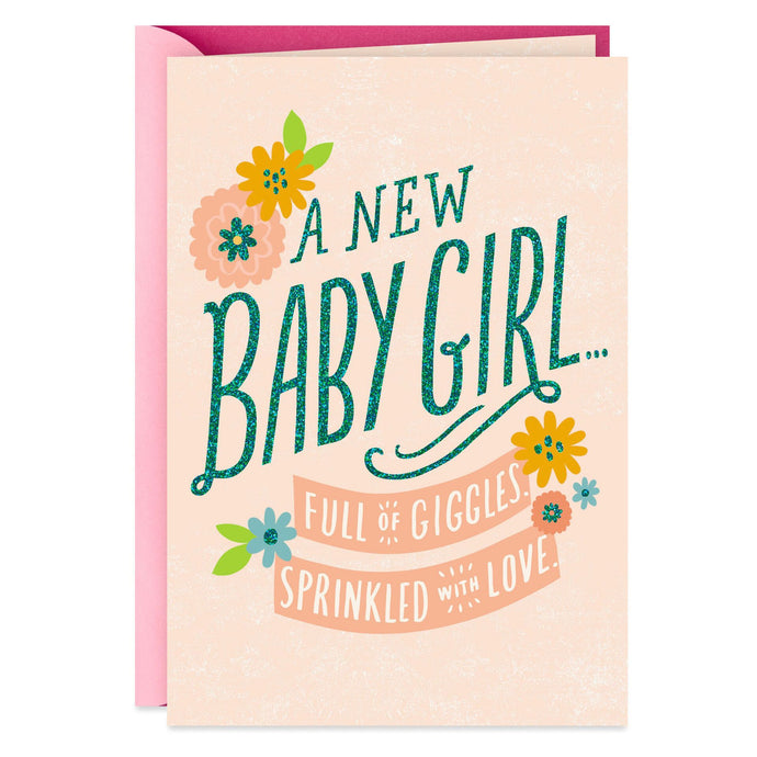 Celebrate the newest pretty-in-pink addition to the human race with this sweet congrats card. She'll bring love and giggles to their family, so let them know just how happy you are for them. Card features glitter accents and a warm message.- New Baby greeting card features glitter.