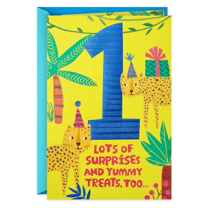 Smiling jungle animals decorate this bright and cheery first birthday card. Open to see a pop-up blue elephant holding a yummy cupcake on its trunk for a fun surprise! It's perfect for a little one-year-old cutie.- Includes envelope and Gold Crown seal. Envelope color may vary.