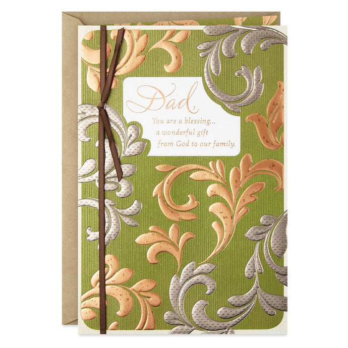 Send your dad wishes for a happy birthday with this faith-filled greeting. This beautiful card celebrates your father as the wonderful gift from God that he is to your family. Greeting finishes with a brown satin ribbon and bow on the card's cover.- Birthday greeting card features embossing, satin ribbon and foil.