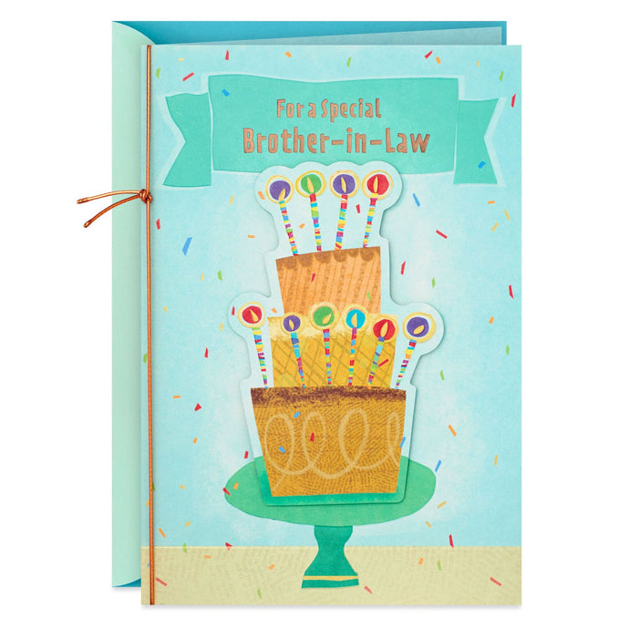 Layer on the appreciation for a great brother-in-law on his birthday when you give him this card featuring a delicious-looking cake that's covered in candles and surrounded by multi-colored confetti. Let him know that on his birthday, and every day, he's loved and appreciated.- Birthday greeting card features die-cut attachment, foil, metallic ink, embossing and elastic cord.
