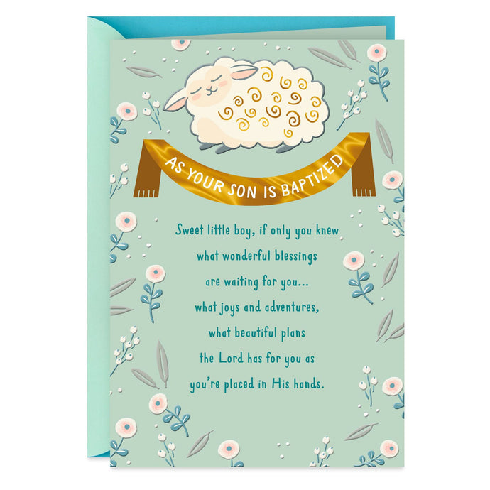 Share in the joy of their little boy's baptism with this cute card featuring a little lamb design and a Bible verse from Psalm 127:3. Embossed design, gold foil accents and metallic ink shine on the cover while the warm message of joy inside the greeting speaks from your heart.- Baptism greeting card for a baby boy features foil, metallic ink and embossing.