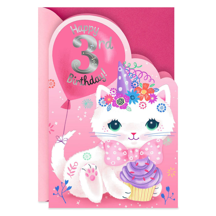 Share a sweet happy third birthday message with your favorite girl when you give this cute greeting. This birthday card for a three-year-old features a die-cut design enhanced with foil and glossy accents.- Birthday greeting card features die-cut design, embossing, foil and glossy accents.