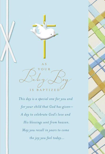 Celebrate God's love and His blessings for a beautiful baby boy on the day of his baptism. This is the perfect card with embossed plaid highlights for grandparents, members of the extended family or godparents to give to the new parents on this memorable day.- Baptism greeting card features embossed design with foil, metallic ink and satin ribbon.