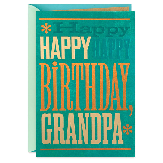 Make your grandpa's birthday happy happy happy! with this colorful greeting. Card features heartfelt birthday wishes that are rolled out in bold block lettering and finished in gold and bronze foil for extra appeal.- Birthday greeting card features foil.
