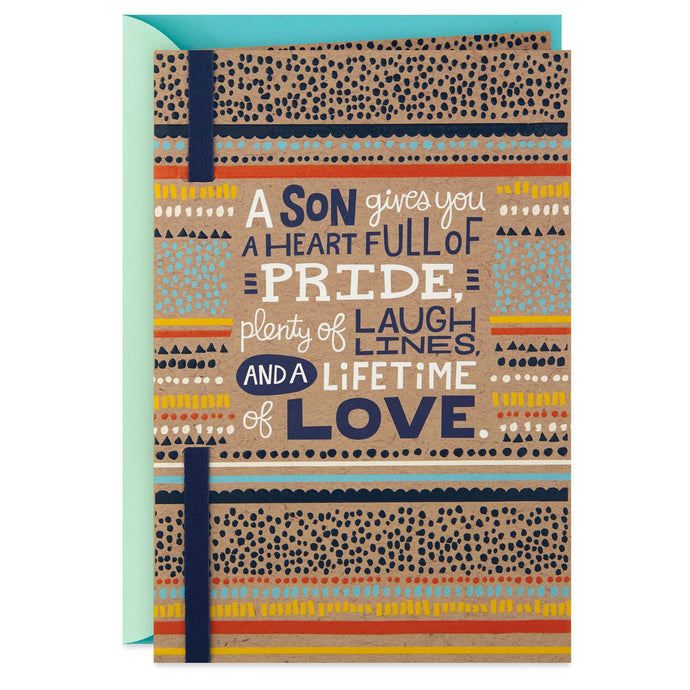 Bright blue, orange and yellow stripes and dots rest against a kraft card stock background, offering a cheerful happy birthday greeting for your son. Share all the pride you feel in him when you give him this love-filled card that's finished with glossy accents for added shine.- Birthday greeting card features glossy accents and woven ribbon.