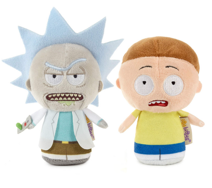 mbark on interdimensional adventures with this plush itty bittys duo. Direct from C-137 (or who knows which dimension, really) comes scientific genius Rick Sanchez, holding his trusty portal gun, and his oh-so-anxious grandson Morty Smith in stylized stuffed animal forms. The itty bittys plush set is perfect for reliving the hilarious hijinks of the animated sci-fi sitcom “Rick and Morty.”
