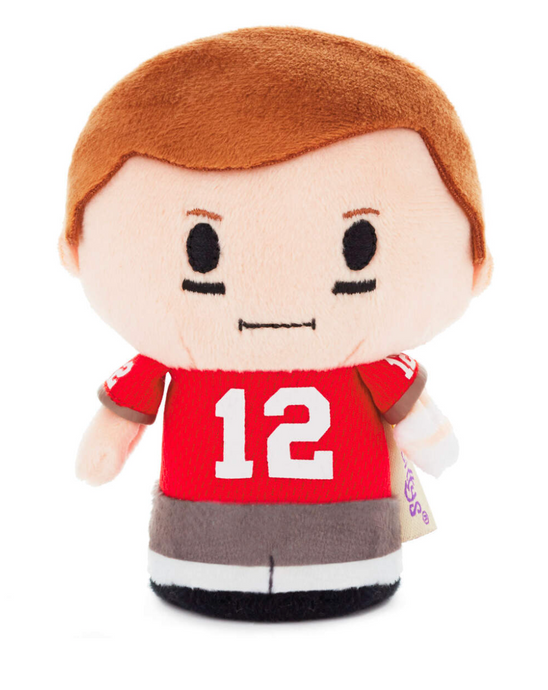 Show off your fandom for one of the NFL's greatest players of all time with this itty bittys version of star quarterback Tom Brady with his signature eye black and red #12 jersey. Die-hard football fans will love bringing home this MVP who continues to stun with his legendary touchdown passes. Or, keep this stylized itty bittys plush for yourself as a good-luck charm for game day. Comes with an attached collector card featuring 2021 season stats.
