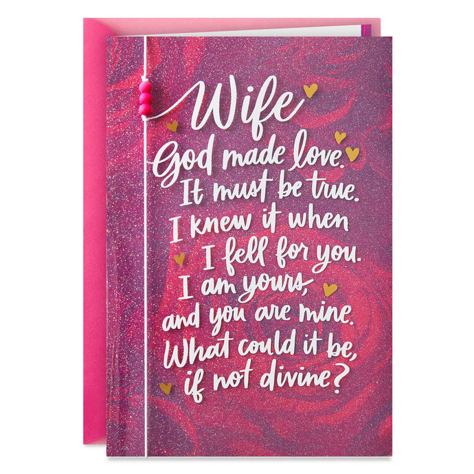 Valentine's Day greeting card for wife features sparkly pink and purple roses and gold hearts paired with a sweet, rhyming message of faith, love and gratitude. Glitter and foil accents with a clear acetate overlay and beaded elastic cord trim.- Includes one card and one envelope with a Gold Crown seal. Envelope color may vary.