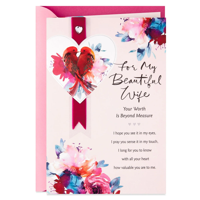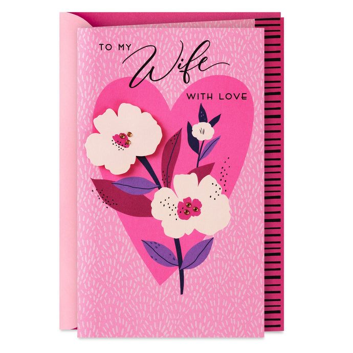 Valentine's Day greeting card for wife features an illustration of a pretty pink heart and flowers paired with a heartfelt message of love and gratitude. Gem accents with a die-cut attachment.- Includes one card and one envelope with a Gold Crown seal. Envelope color may vary.