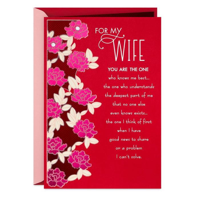 Valentine's Day greeting card for your wife features a border of elegant pink foil flowers on a red background paired with a heartfelt message of love and gratitude. Sparkly gem accents and velvety flocked details dress up this romantic valentine for her.- Includes one card and one envelope with a Gold Crown seal. Envelope color may vary.