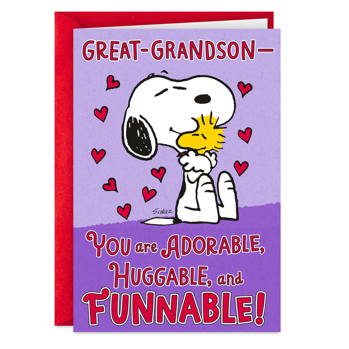 Peanuts Valentine's Day greeting card for great-grandson features a cute design of Snoopy and Woodstock hugging and hearts all around them.- Includes one card and one envelope with a Gold Crown seal. Envelope color may vary.