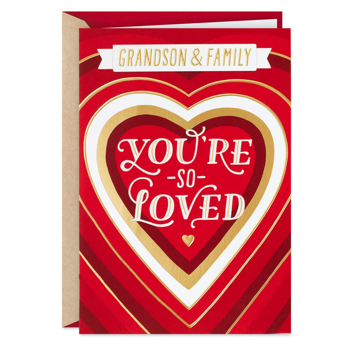 Valentine's Day greeting card for grandson and his family features a bold design of hearts within hearts. Shiny gold foil accents and embossed details add special touches.- Includes one card and one envelope with a Gold Crown seal. Envelope color may vary.