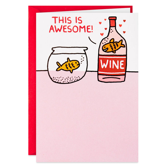 Funny Valentine's Day greeting card features a humorous cartoon illustration of a cheerful fish swimming in a bottle of wine as another fish glumly looks on from its fishbowl. The fun message is sure to happy-up any Valentine's Day! Matte finish.- Includes one card and one envelope with a Gold Crown seal. Envelope color may vary.
