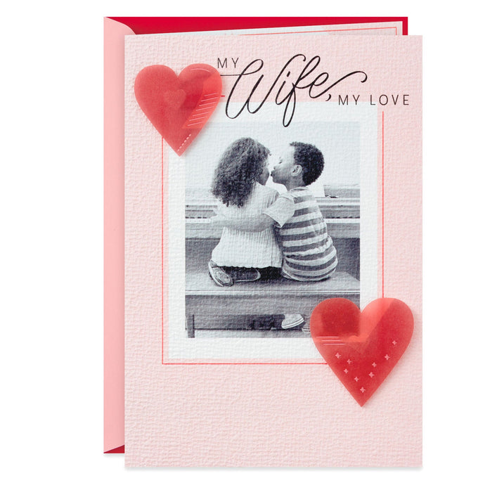 Valentine's Day greeting card for wife features a sweet black and white photo of two kids sharing a kiss on a piano bench and foil-stamped vellum paper heart attachments paired with a heartfelt message of love.- Includes one card and one envelope with a Gold Crown seal. Envelope color may vary.