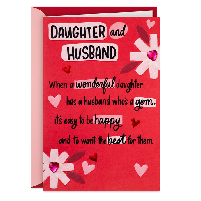 Valentine's Day greeting card for your daughter and her husband features an illustration of hearts and flowers paired with a sweet rhyming message. A sparkly heart-shaped gem, red foil hearts, glossy accents and embossed details add charming finishing touches to this valentine for them both.- Includes one card and one envelope with a Gold Crown seal. Envelope color may vary.