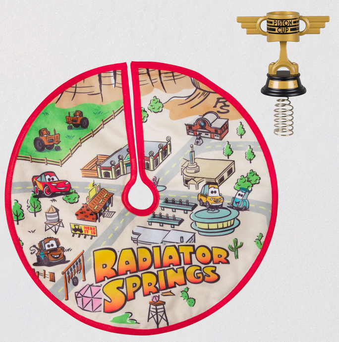 Miniature Disney/Pixar Cars Radiator Springs Tree Topper and Christmas Tree Skirt SetRev up the fun on your tabletop tree with this set that includes a Disney/Pixar Cars themed miniature tree topper and miniature tree skirt. The mini fabric tree skirt boasts red trim with a sublimated design of Lightning McQueen, Mater, Luigi and Guido in Radiator Springs. Coordinating Piston Cup mini tree topper features a metal spring coil base.