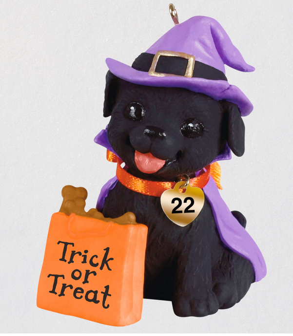 Puppy Love Howl-O-Ween 2022 OrnamentBring a dose of Puppy Love to your fall decor with this fun Halloween ornament. A cute little black lab wears a witch's hat and cape as it sits and guards a trick-or-treat bag full of bones. An orange bow around pup's neck features a year-dated "22" brass charm.